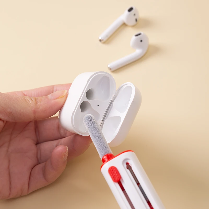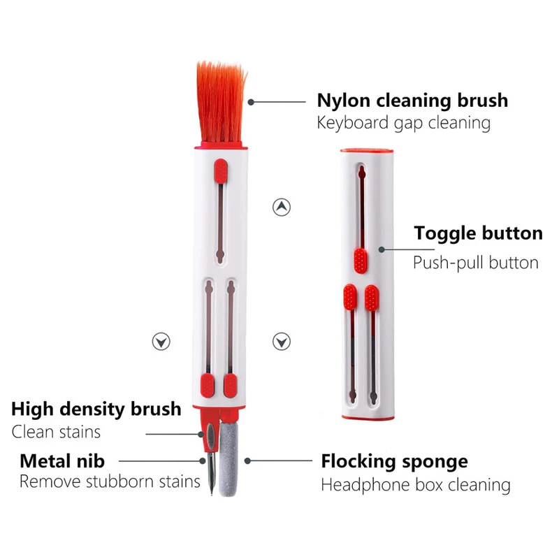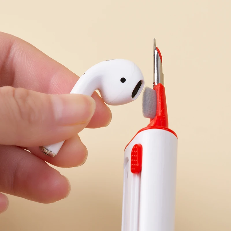 نوک قلم فلزی شکاف و گرد وغبار سخت را کاملاً تمیز میکند. اسفنج Flocking می تواند گرد و غبار موجود در جعبه شارژ بی سیم هدفون را تمیز کند.برس با چگالی بالا کثیفی های سوراخ خروجی صدای گوشی و سایر قسمت ها را به راحتی تمیز میکند .